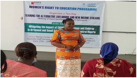 Women’s Right to Education Programme (WREP) in partnership with Extractives Global Programmatic Support (EGPS) has held a two day training 27th-28th April, 2021 for alternative livelihoods and new income streams focused on making of hand sanitizers and liquid soap under the project: Mitigating the Impact of Covid -19 pandemic on Women and Children in Artisanal and Small Scale Mining in North Central Nigeria.