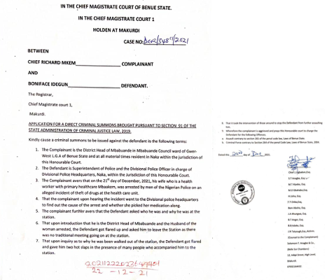 District Head of Mbabunda Council Ward of Gwer West LGA of Benue State, Chief Richard Mkem has recently brought a direct criminal summons pursuant to section 91 of the state administration of criminal justice law 2019 before the Magistrate Court 1 holding in Makurdi, against a superintendent of police, Boniface Idegun.